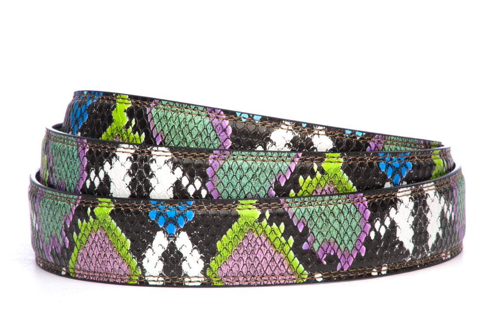 This Multi-Colored Boa print strap is made with an animal friendly PU faux leather material that features a boa scale pattern with great texture. The color pattern of this particular strap for the CAS sale will be one of our 5 multi-colored boa color dominant patterns, chosen at random.